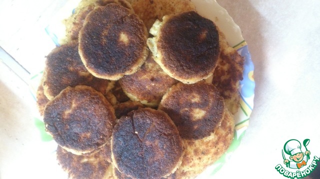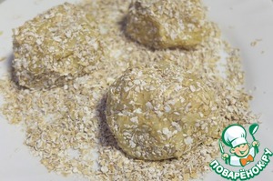 Формируем небольшие шарики, обваливаем в панировочных сухарях., формируем оладушек.