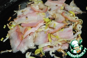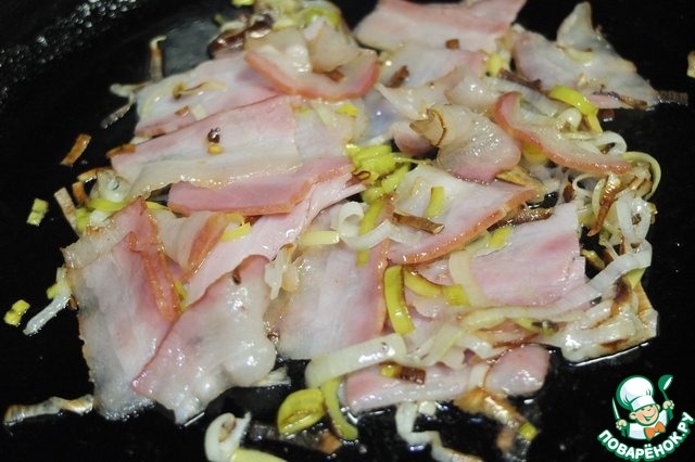 Параллельно обжариваем лук-порей, с крупно нарезанными кусочками бекона.