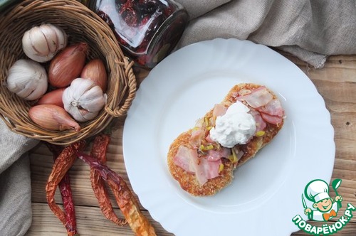 Выкладываем оладьи на тарелку, сверху выкладываем обжаренный бекон с луком и столовую ложку сметаны. У меня домашние сливки. Подаем горячим!