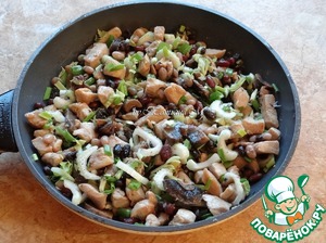 Грудку и шампиньоны нарезать, обжарить на масле до корочки