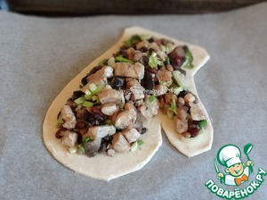 Одну рукавичку выложить на пергамент на противень, наполнить начинкой горкой, отступая от края