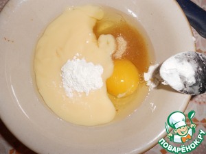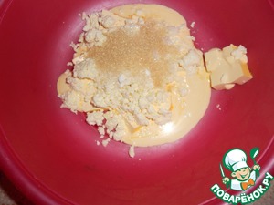 К размягченному маслу добавить сахар, творог, муку с разрыхлителем, щепотку соли.