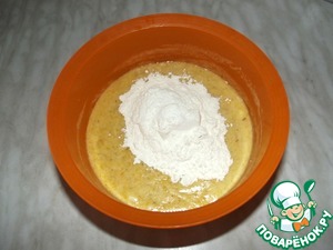 Добавить муку и разрыхлитель, тщательно перемешать.