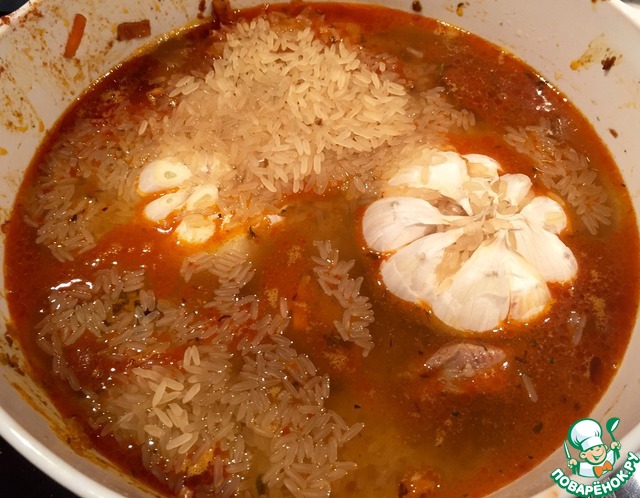 Всыпьте сверху рис и налейте воды, чтобы она прикрывала мясо с рисом на 2 пальца.