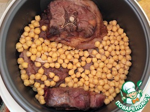 Говяжьи голяшки и баранью шею быстро обжарить на остатках масла, сложить в чашу мультиварки. Добавить в кастрюльку промытый и заранее замоченный нут.