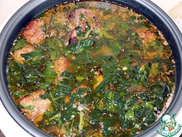 Добавляем в кастрюльку обжаренные колобки и лук с шпинатом.