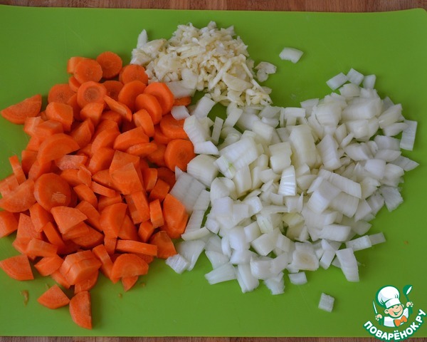 Подготовить и нарезать овощи: лук — средними полукольцами (или кубиками, как у меня на этот раз), морковь — небольшими кубиками, чеснок мелко порубить. Духовку включить разогреваться на 200°С.