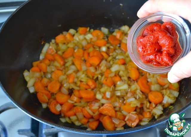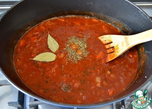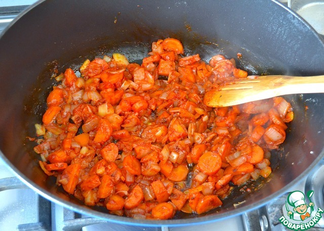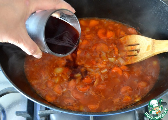 Следом добавить вино, консервированные помидоры и говяжий бульон.