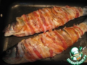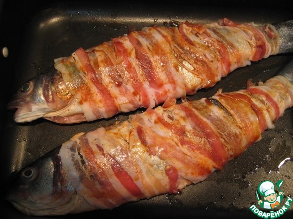 Может показаться странным сочетание мяса с рыбой, но, поверьте- это очень вкусно! Бекон очень "идет" рыбе! Сибас получается очень нежным, весь в соку, а бекон придает рыбе копченый аромат!