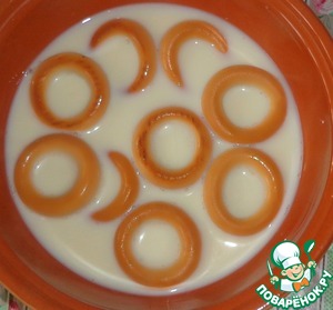 Сушки залить теплым молоком и оставить на 15 минут, чтобы они стали мягкими.