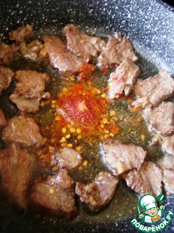 • Промаринованное мясо нарезать тоненькими ломтиками-лепестками и быстро обжарить на масле, переворачивая и чуть подрумянивая. Не пережарить! В середине приготовления разгрести мясо по краям сковороды и всыпать в середину хлопья чили и молотую паприку. Дать пропитаться маслом, затем перемешать с мясом и снять с огня.