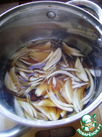 • Лук нарезать тонко - лучше вдоль луковицы - плакать будете меньше - проверено! Вскипятить стакан воды, добавить сахар, 100 мл соевого соуса, 2 ст. ложки уксуса, снять с огня и опустить туда лук. Оставить до остывания. А дальше - по обстоятельствам - или сразу хорошо отцедить и в салат - или можно хранить в маринаде пару дней. Кстати, маринад вполне можно повторно использовать для маринования мяса, к примеру.