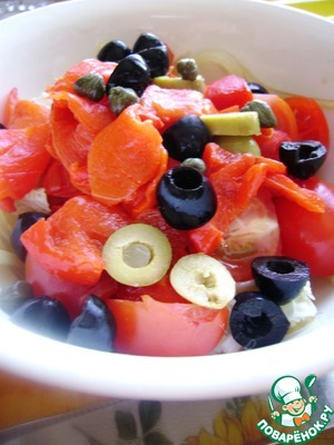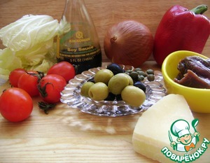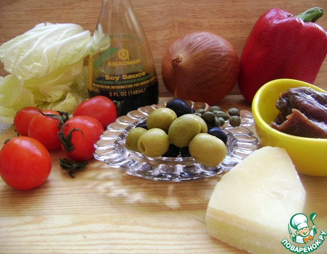 • Салат промыть, хорошо обсушить и нарвать некрупным кусочками. Отлично сюда подошел бы айсберг, но в нашей дальней дали его просто так не купить. Помидоры черри разрезать пополам, оливки и маслины тоже нарезать половинками. Каперсы ополоснуть от рассола. Сложить все продукты в просторную миску. Добавить лук – не забыли?