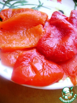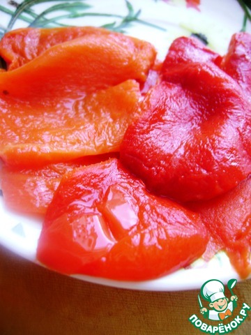 • Мясистый красный перец запечь в духовке, или микроволновке, или гриле, до подпалин, убрать в посуду с крышкой и дать остыть. После чего снять кожицу и нарезать лепестками.