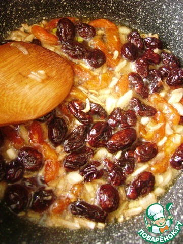 Прогреть пару минут без поджаривания и выложить сухофрукты.