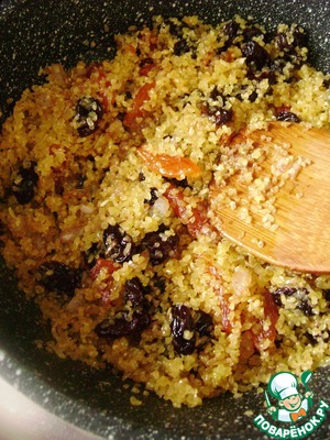 Выложить к сухофруктам булгур и помешивая, дать ему пропитаться маслом.
