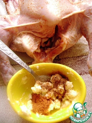 Приподнять кожу на грудке цыпленка и распределить там масляную смесь-больше половины. -