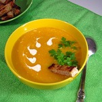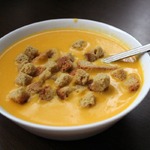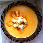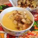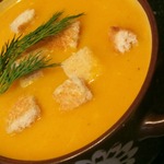 Суп-пюре с тыквой, плавленым сыром и сухариками. Сытное, согревающее в холода блюдо! Яркие краски и вкус всех ингредиентов делают этот суп насыщенным как по цвету, так и по вкусу!
