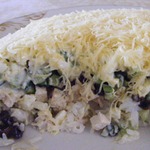 Слои - рис - куриная грудка - чернослив - огурец - яйца - сыр. -