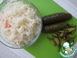 Квашеную капусту отжать от рассола, а маринованные огурцы нарезать соломкой.