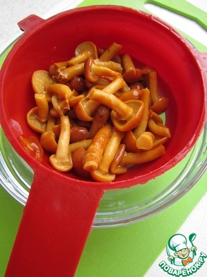 Маринованные грибы откинуть на дуршлаг и промыть хорошенько проточной водой. Дать стечь воде.
