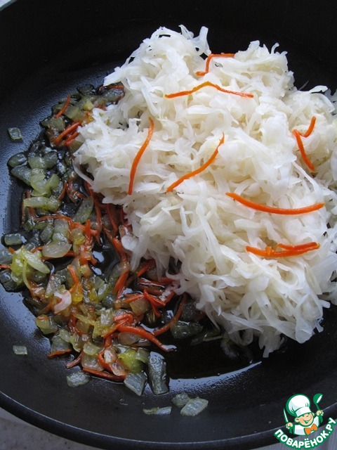 Добавить квашеную капусту к луку и моркови и быстро обжарить, при постоянном помешивании, до готовности капусты. Степень её обжарки вы определяете для себя сами.