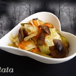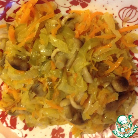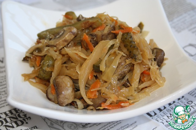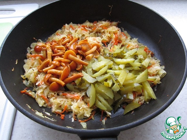 Осталось добавить к капусте маринованные грибы и нарезанные соломкой огурцы. Приправить овощи сахаром и молотым перцем, если нужно, подсолить. Я соль не добавляла. Хорошенько перемешать будущую закуску и потомить на среднем огне пять минут. Остудить.