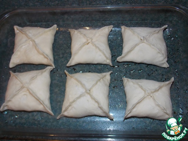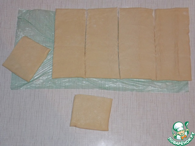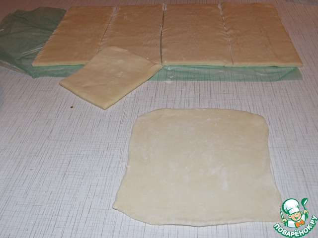 Готовое слоено-дрожжевое тесто разморозить, нарезать квадратиками