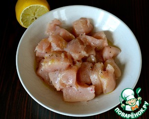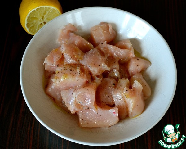 Куриное филе нарезать небольшими кусочками. Выложить в глубокую тарелку, сбрызнуть соком лимона, посолить, поперчить и слегка сбрызнуть оливковым маслом. Как следует все перемешать и отставить в сторону мариноваться.