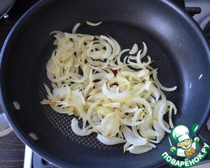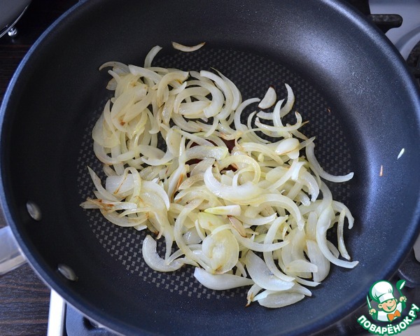 Лук нарезать полукольцами и обжарить с 2-мя ст. л. оливкового масла до легкого золотистого цвета. Отставить в сторону.