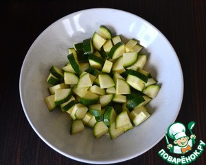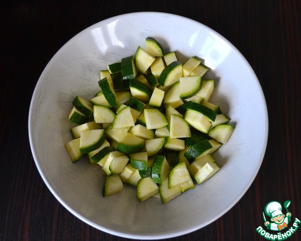 Тем временем кабачок цуккини нарезать на небольшие кубики (вместо цукини можно использовать другие овощи по Вашему желанию, в рецепте-оригинале был красный сладкий перец).