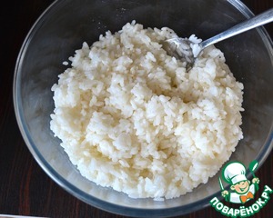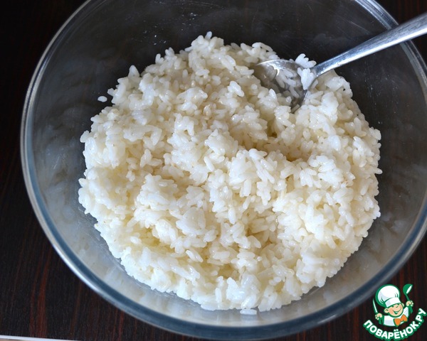 Рис отварить до полуготовности в слегка подсоленой воде. Готовый рис слить и обдать холодной водой, чтобы остановить процесс приготовления. Он должен получиться рассыпчатым.
