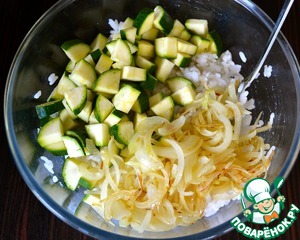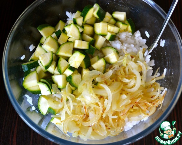 В миску с остывшим рисом положить нарезанные цуккини и лук.
