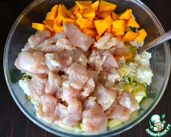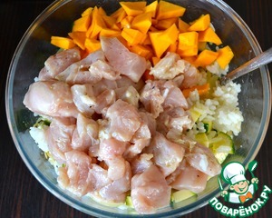 Добавить куриное филе и кусочки тыквы. Все как следует перемешать. Посолить и поперчить по вкусу. Начинка готова!