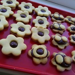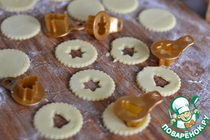 Раскатать вторую часть теста, вырезать кружочки, но уже сделать в середине отверстия формочками или стаканчиком меньшего диаметра.