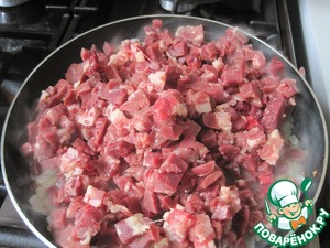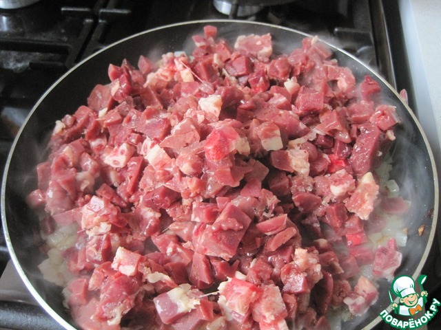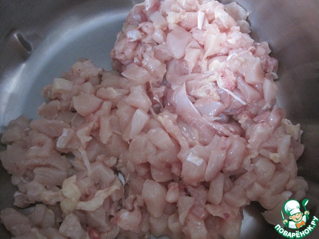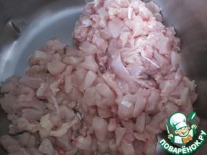 Добавляем нарезанную кубиками печень и куриные сердечки.