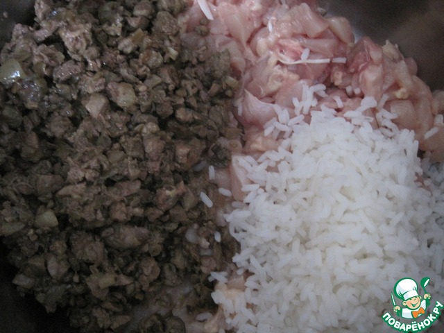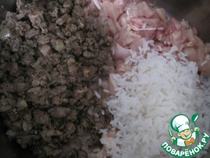 Соединяем печень, мякоть курицы, рис, добавляем соевый соус