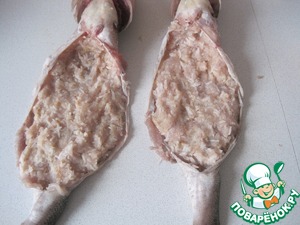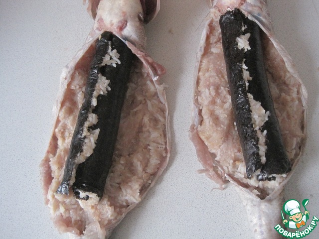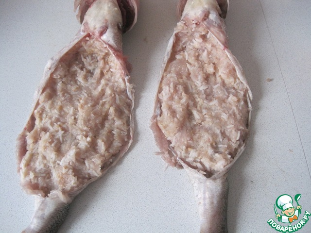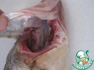 У рыбы удаляем жабры, и в это место наполняем фаршем.