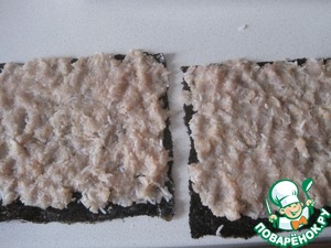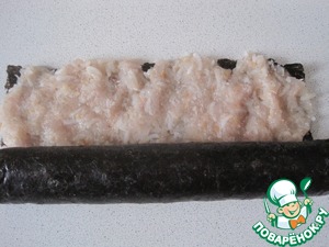 Кожицу рыбы раскладываем и распределяем фарш слоем 1 см.