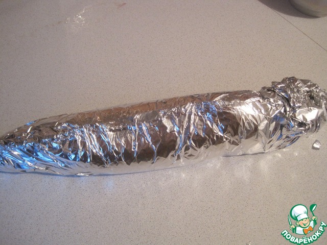 Закрепляем, шов фольги остается сверху. Кладем на противень с небольшим количеством воды и запекаем при температуре 200* 45 мин.