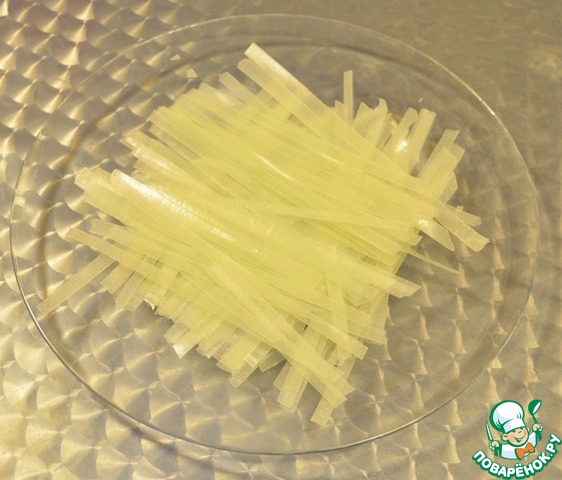 - Фунчоза ( Не тонкая белая, а широкая с зелёным горошком. Если такой нет, то подойдёт, в принципе, любая) — 160 г