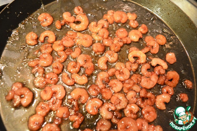 Потом влить гранатовый соус и жарить креветки до появления карамельного блеска. Сразу переложить креветки со сковороды в миску, чтобы остановить процесс приготовления.