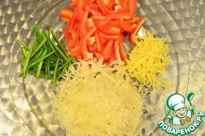 Перец болгарский и перец чили очистить от семян и порезать тонкой соломкой.