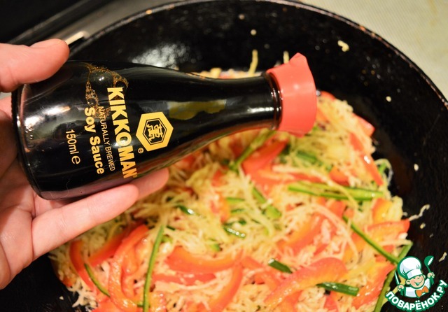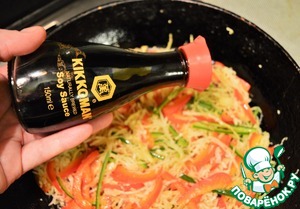 В сковороде разогреть растительное масло и обжарить в масле имбирную соломку до появления аромата. Добавить к имбирю соломку из дайкона и жарить, помешивая, около 3-х минут. Далее положить соломку из болгарского перца и перца чили и жарить, помешивая, ещё 2 минуты. Добавить в сковороду соевый соус «Kikkoman», молотый чёрный кардамон, всё перемешать и снять с огня.