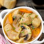 Затем налить ~350-400 мл воды или бульона (чтоб слегка покрывала мясо). Довести до кипения и огонь убавить на минимум. Добавить лавровый лист, прикрыть (не полностью) крышкой и тушить 20 минут, периодически помешивая. -