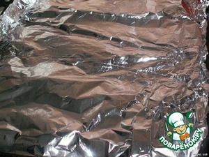 Накрыть фольгой и поставить в предварительно нагретую духовку до 250 градусов минут на десять, убавить температуру до 220 градусов и готовить ещe 30 минут (до готовности картошки).
