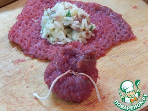 Фарш выкладываем в центр. Формируем мешочек. Завязываем кулинарной нитью.