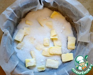 Форму (26 см диаметром) застелить пекарской бумагой. Разложить кусочки сливочного масла и посыпать половиной стакана сахара. -
