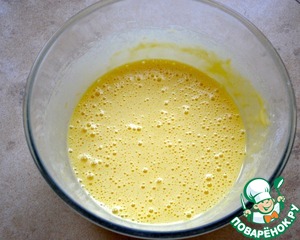 Приготовить тесто: взбить 3 яйца с 3-мя столовыми ложками сахара в густую пену и добавить 3 столовые ложки муки с щепоткой разрыхлителя.