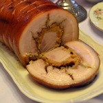 7. За 20 минут до готовности снять с рулета фольгу, смазать поверхность выделившимся при запекании соком и запечь до подрумянивания корочки. Будьте внимательны, не пересушите корочку! Дать рулету постоять около 15 минут под фольгой или пергаментом, чтобы все соки внутри мяса распределились равномерно, и нарезать острым ножом (если подаете рулет в качестве горячего). Если рулет будет подаваться в качестве холодной закуски, то лучше приготовить рулет накануне, хорошо охладить его и нарезать непосредственно перед подачей.